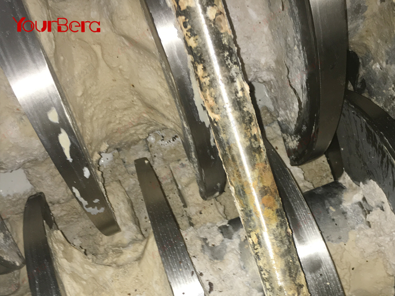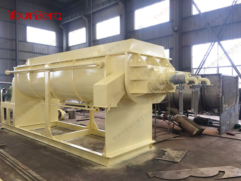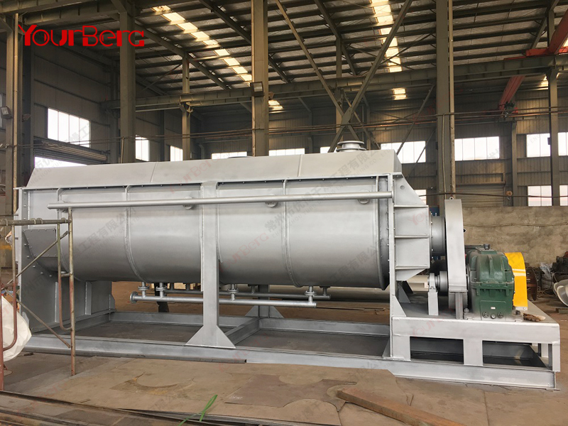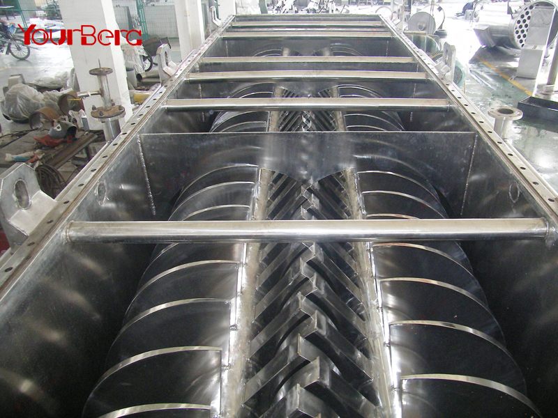 空心軸上密集排列著楔型中空漿葉,熱介質(zhì)經(jīng)空心軸流經(jīng)漿葉。單位有效容積內(nèi)傳熱面積很大,熱介質(zhì)溫度從-40℃到320℃,可以是水蒸汽,也可以是液體型:如熱水、導(dǎo)熱油等。間接傳導(dǎo)加熱,沒(méi)有攜帶空氣帶走熱量,熱量均用來(lái)加熱物料。熱量損失僅為通過(guò)器體保溫層向環(huán)境的散熱。楔型漿葉傳熱面具有自清潔功能。物料顆粒與楔型面的相對(duì)運(yùn)動(dòng)產(chǎn)生洗刷作用,能夠洗刷掉楔型面上附著物料,使運(yùn)轉(zhuǎn)中一直保持著清潔的傳熱面。漿葉干燥機(jī)的殼體為Ω型,殼體內(nèi)一般安排二到四根空心攪拌軸。殼體有密封端蓋與上蓋,防止物料粉塵外泄而充分發(fā)揮作用。