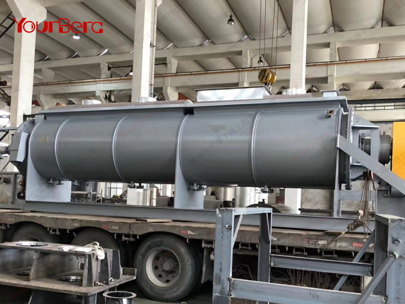 空心軸上密集排列著楔型中空漿葉,熱介質經空心軸流經漿葉。單位有效容積內傳熱面積很大,熱介質溫度從-40℃到320℃,可以是水蒸汽,也可以是液體型:如熱水、導熱油等。間接傳導加熱,沒有攜帶空氣帶走熱量,熱量均用來加熱物料。熱量損失僅為通過器體保溫層向環境的散熱。楔型漿葉傳熱面具有自清潔功能。物料顆粒與楔型面的相對運動產生洗刷作用,能夠洗刷掉楔型面上附著物料,使運轉中一直保持著清潔的傳熱面。漿葉干燥機的殼體為Ω型,殼體內一般安排二到四根空心攪拌軸。殼體有密封端蓋與上蓋,防止物料粉塵外泄而充分發揮作用。