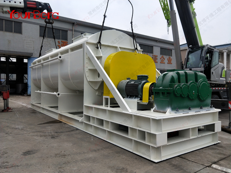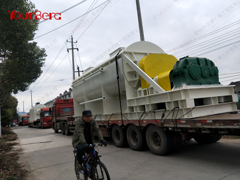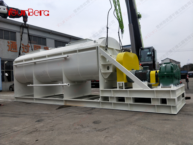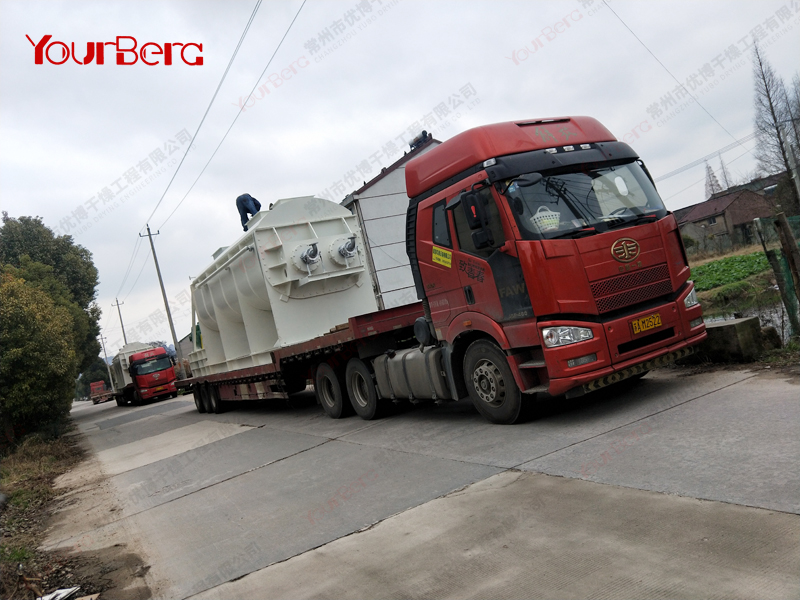 空心軸上密集排列著楔型中空漿葉,熱介質經空心軸流經漿葉。單位有效容積內傳熱面積很大,熱介質溫度從-40℃到320℃,可以是水蒸汽,也可以是液體型:如熱水、導熱油等。間接傳導加熱,沒有攜帶空氣帶走熱量,熱量均用來加熱物料。熱量損失僅為通過器體保溫層向環境的散熱。楔型漿葉傳熱面具有自清潔功能。物料顆粒與楔型面的相對運動產生洗刷作用,能夠洗刷掉楔型面上附著物料,使運轉中一直保持著清潔的傳熱面。漿葉干燥機的殼體為Ω型,殼體內一般安排二到四根空心攪拌軸。殼體有密封端蓋與上蓋,防止物料粉塵外泄而充分發揮作用。