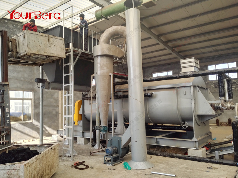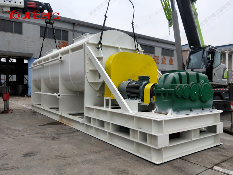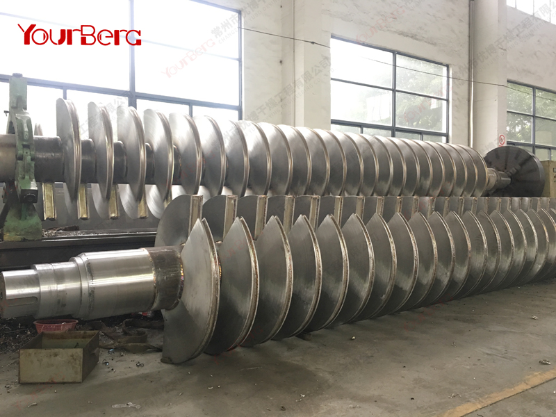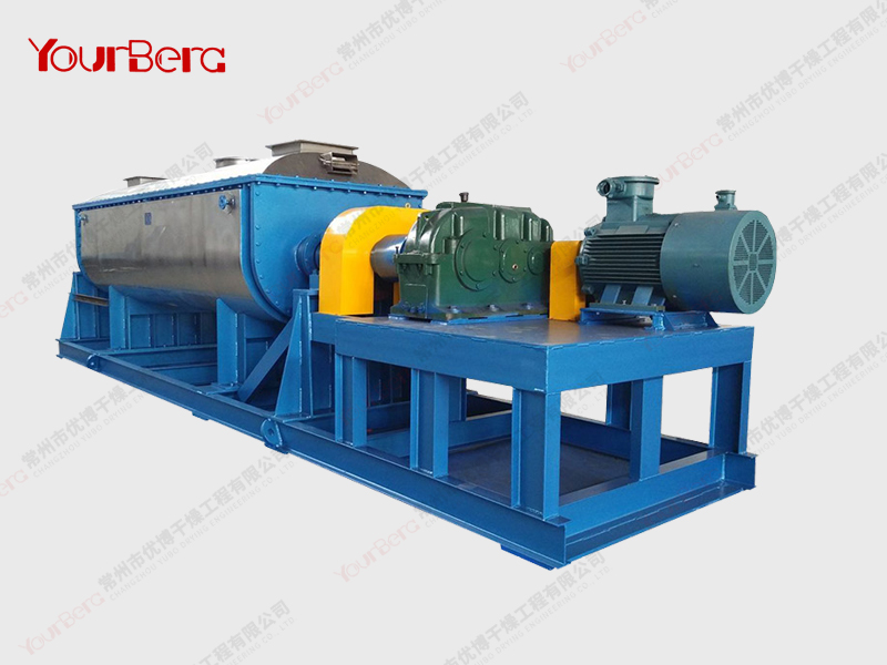 空心軸上密集排列著楔型中空漿葉,熱介質經空心軸流經漿葉。單位有效容積內傳熱面積很大,熱介質溫度從-40℃到320℃,可以是水蒸汽,也可以是液體型:如熱水、導熱油等。間接傳導加熱,沒有攜帶空氣帶走熱量,熱量均用來加熱物料。熱量損失僅為通過器體保溫層向環境的散熱。楔型漿葉傳熱面具有自清潔功能。物料顆粒與楔型面的相對運動產生洗刷作用,能夠洗刷掉楔型面上附著物料,使運轉中一直保持著清潔的傳熱面。漿葉干燥機的殼體為Ω型,殼體內一般安排二到四根空心攪拌軸。殼體有密封端蓋與上蓋,防止物料粉塵外泄而充分發揮作用。