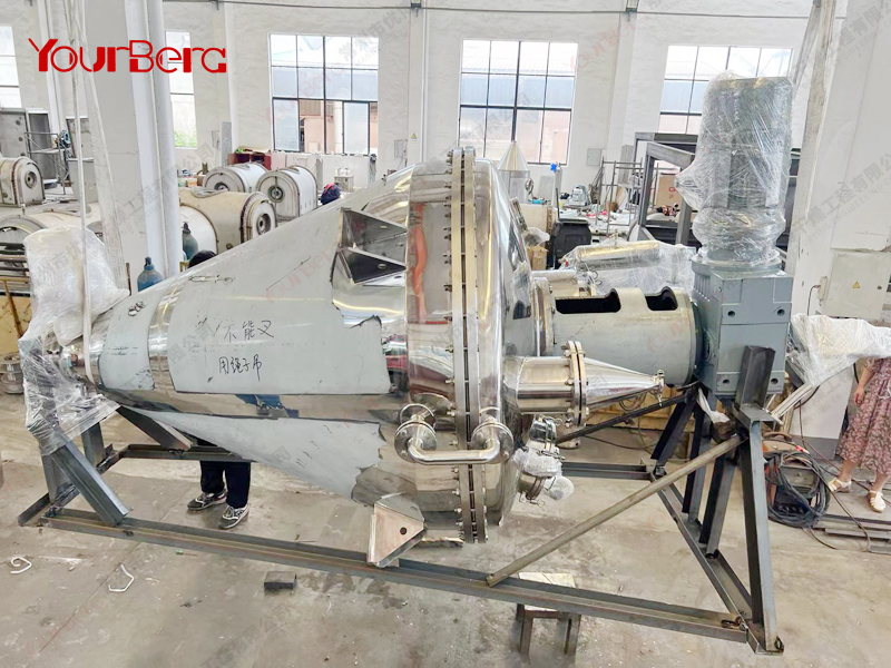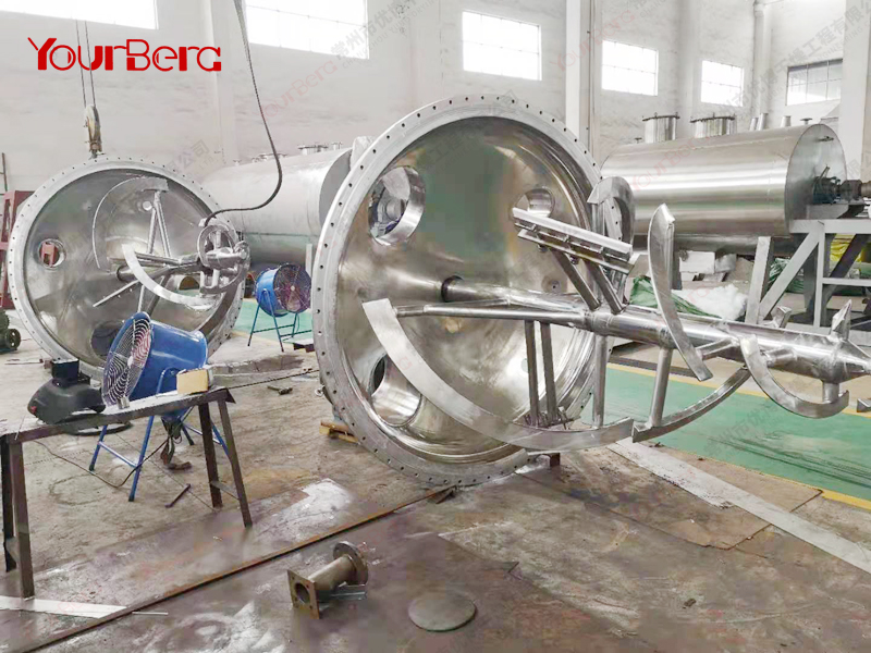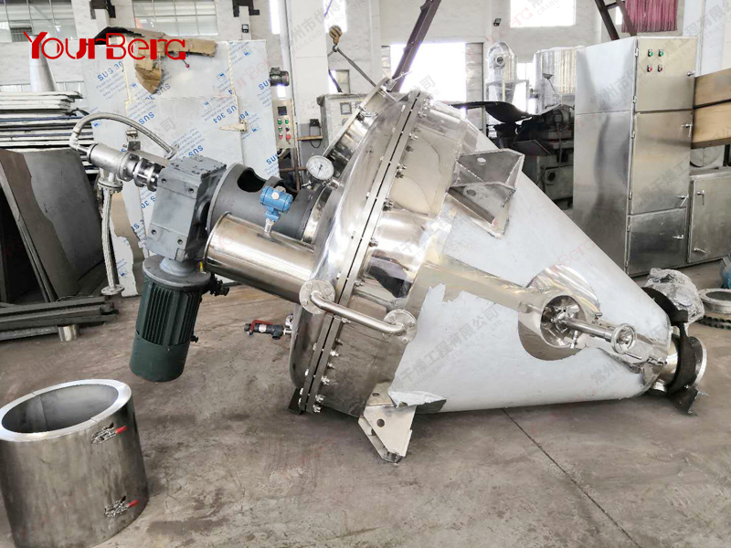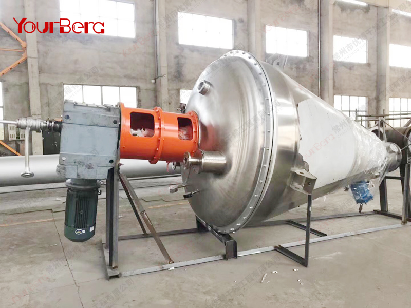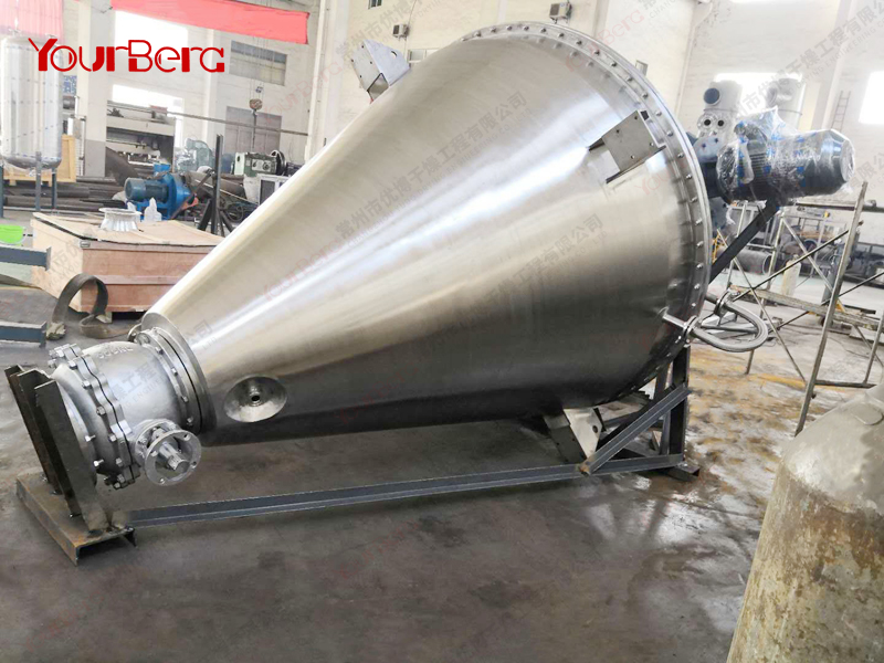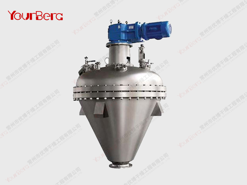 1、單錐真空干燥機工作過程為間歇批操作,濕物料進入料倉后,通過筒壁夾套和螺旋槳內部給熱,使給熱面積達到整個容器面積的140%,對物料進行升溫干燥。并選擇相應的錐型干燥混合器型號(工作容積)達到理想的干燥效果。采用上驅式結構的混合干燥機具有高效干燥、混合能力的同時,具有空間充裕,更便于使用者進行檢修維護的特點。
