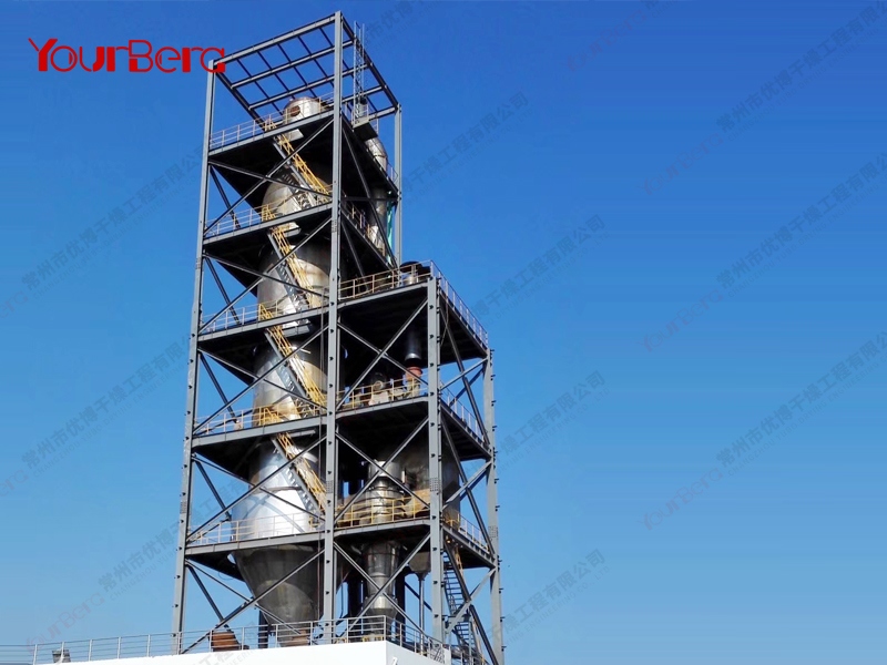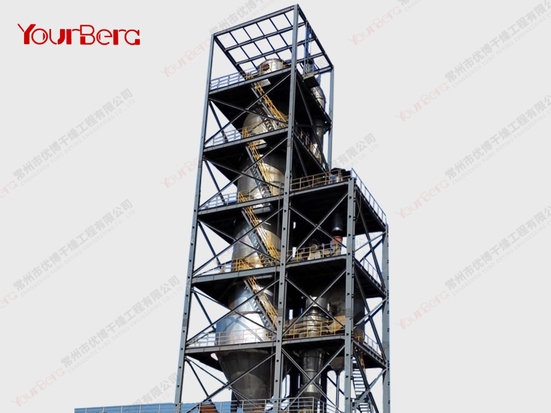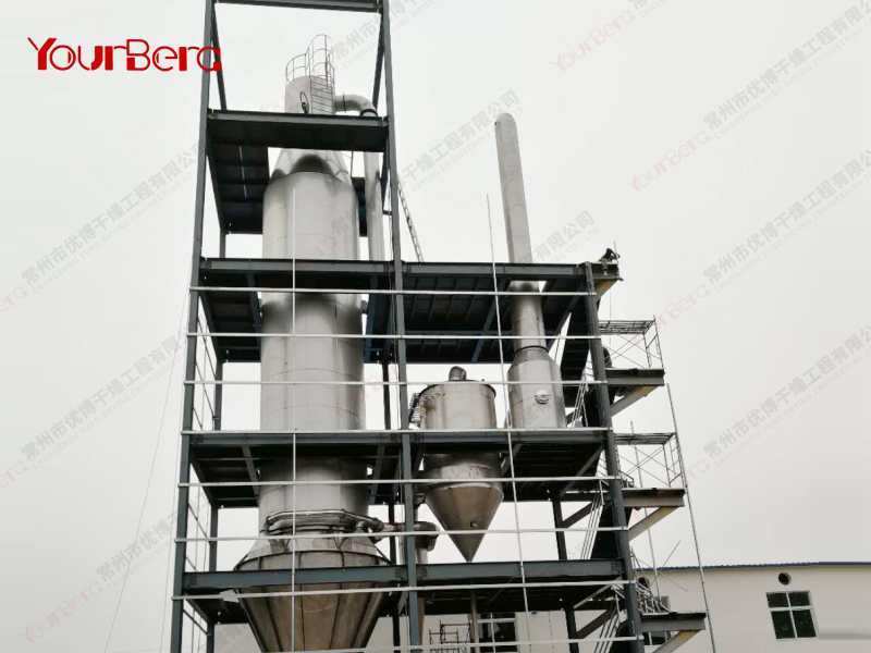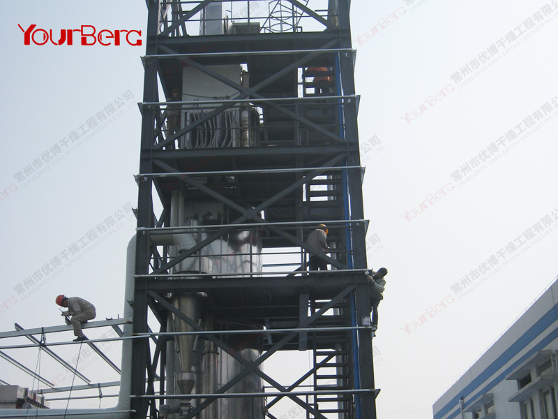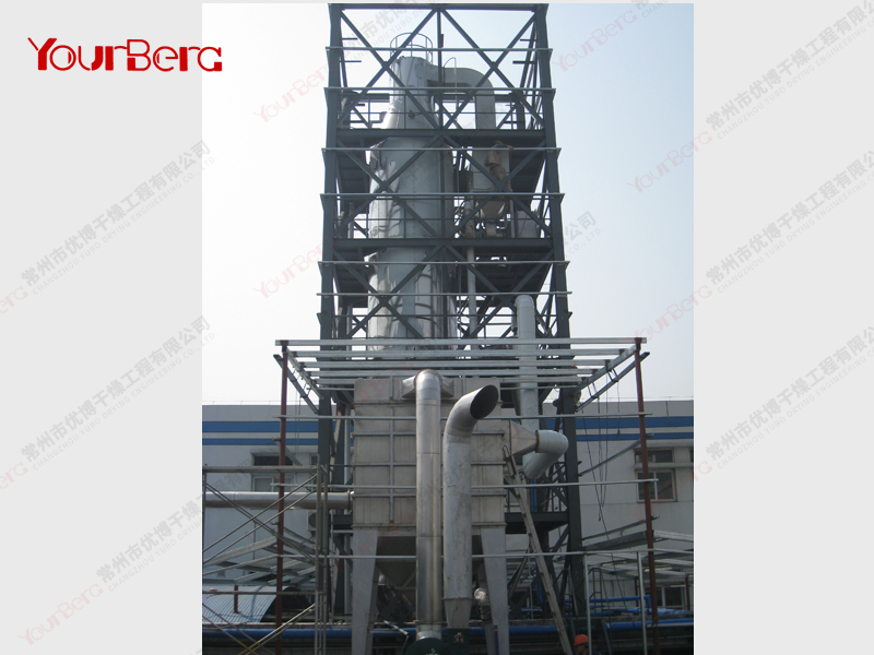 料液通過隔膜泵高壓輸入,噴出霧狀液滴,然后同熱空氣并流下降,大部分粉粒由塔底排料口收集,廢氣及其微小粉末經旋風分離器分離,廢氣由抽風機排出,粉末由設在旋風分離器下端的授粉筒收集,風機出口還可裝備二級除塵裝置,回收率在96-98%以上。