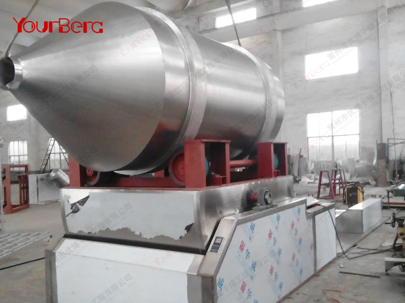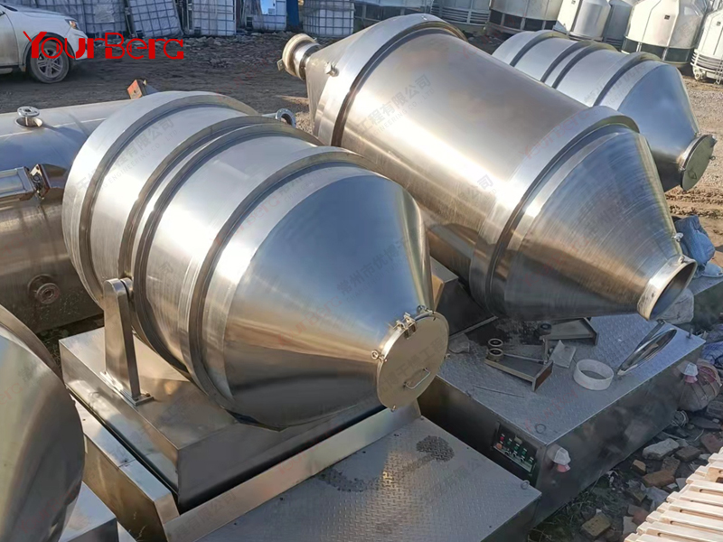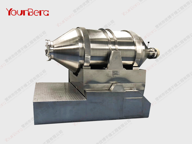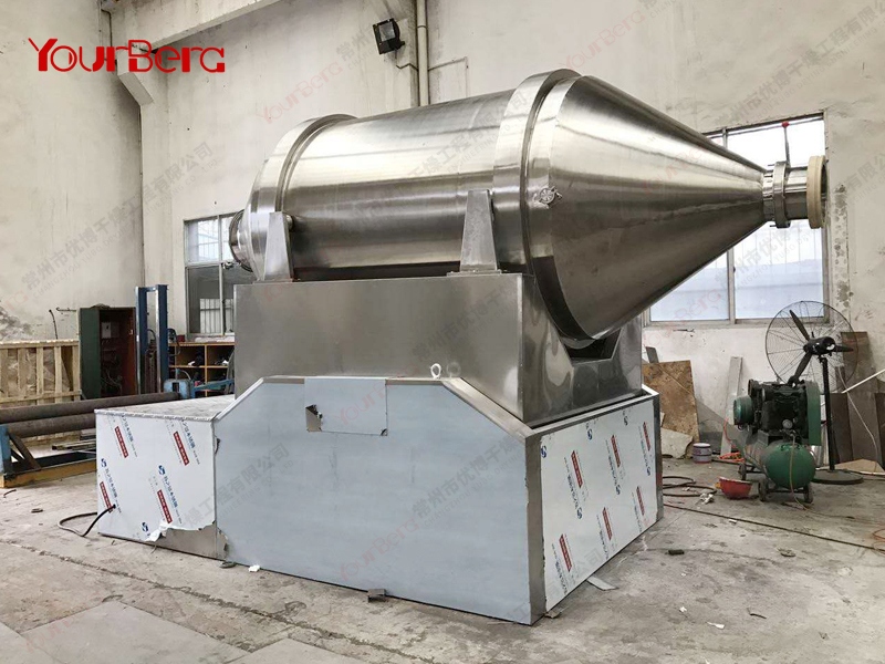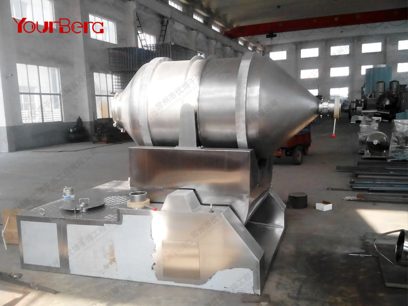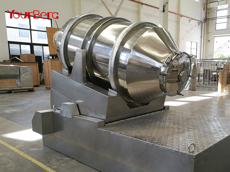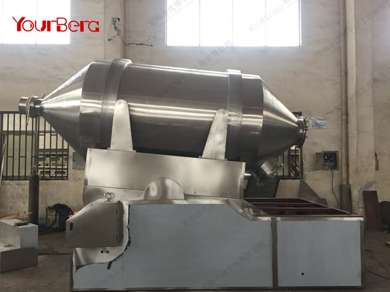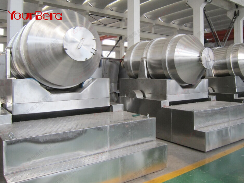 EYH系列二維運動混合機主要由轉筒、擺動架、機架三大部分構成。轉筒裝在擺動架上,由四個滾輪支撐并由兩個擋輪對其進行軸向定位。在四個支撐滾輪中,其中兩個傳動輪由轉動動力系統拖動使轉筒產生轉動;擺動架由一組曲柄擺桿機構來驅動,曲柄擺桿機構裝在機架上,擺動架由軸承組件支撐在機架上。