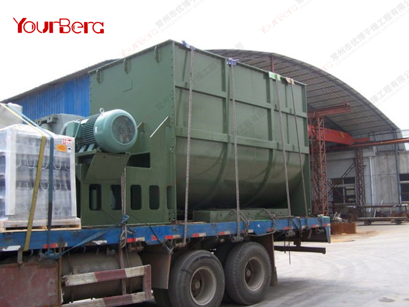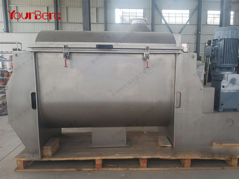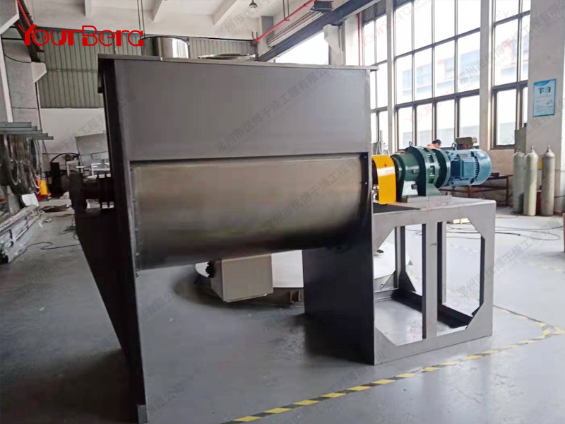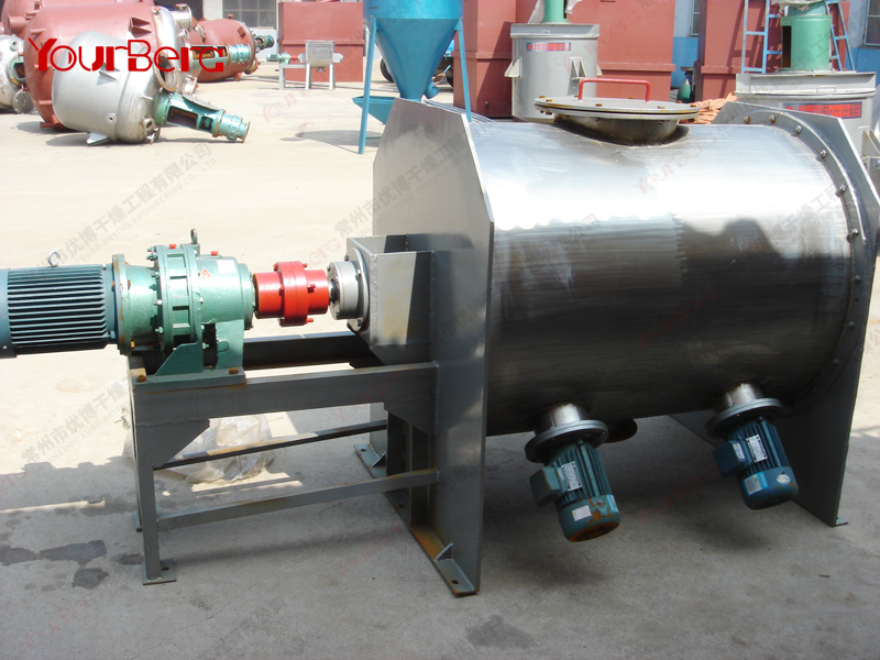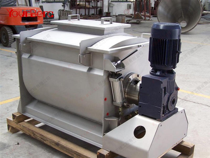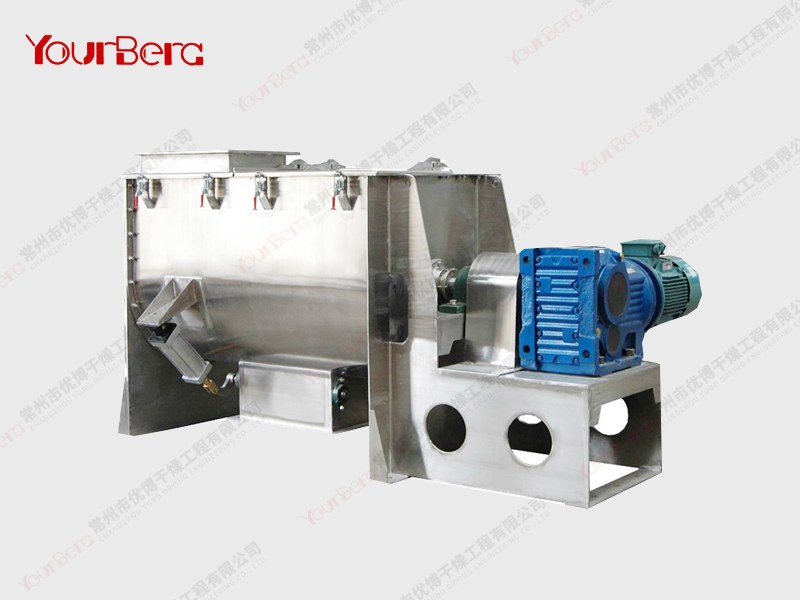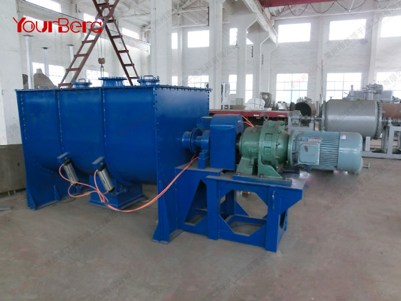 臥式螺帶混合機(jī)由安裝于攪拌軸上的內(nèi)外徑螺旋帶動桶體內(nèi)物料翻動,使攪拌器在桶體內(nèi)大范圍翻動物料。攪拌器結(jié)構(gòu)上,螺旋設(shè)計(jì)成內(nèi)外、左右互為反螺旋,攪拌器工作時內(nèi)螺旋帶動靠近軸心處物料做軸心旋轉(zhuǎn),軸向由內(nèi)至兩側(cè)推動,外螺旋帶動靠近筒壁物料做軸心旋轉(zhuǎn),軸向由兩側(cè)至內(nèi)推動,于是造成物料在筒體內(nèi)對流循環(huán)、剪切滲混,完成物料在較短時間內(nèi)快速均勻混合。